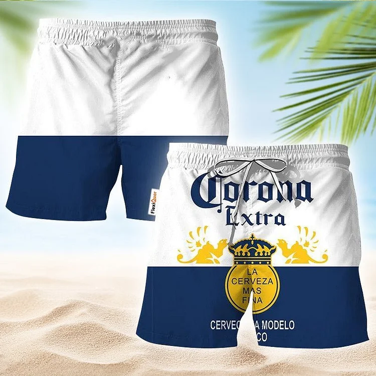 The Corona Extra Blue And White Basic Swim Trunks feature vibrant high-definition printing that enhances their visual appeal. The colors are bright and eye-catching, ensuring you stand out in any crowd. Plus, the design is durable and will never peel, flake, or crack, even after multiple washes.